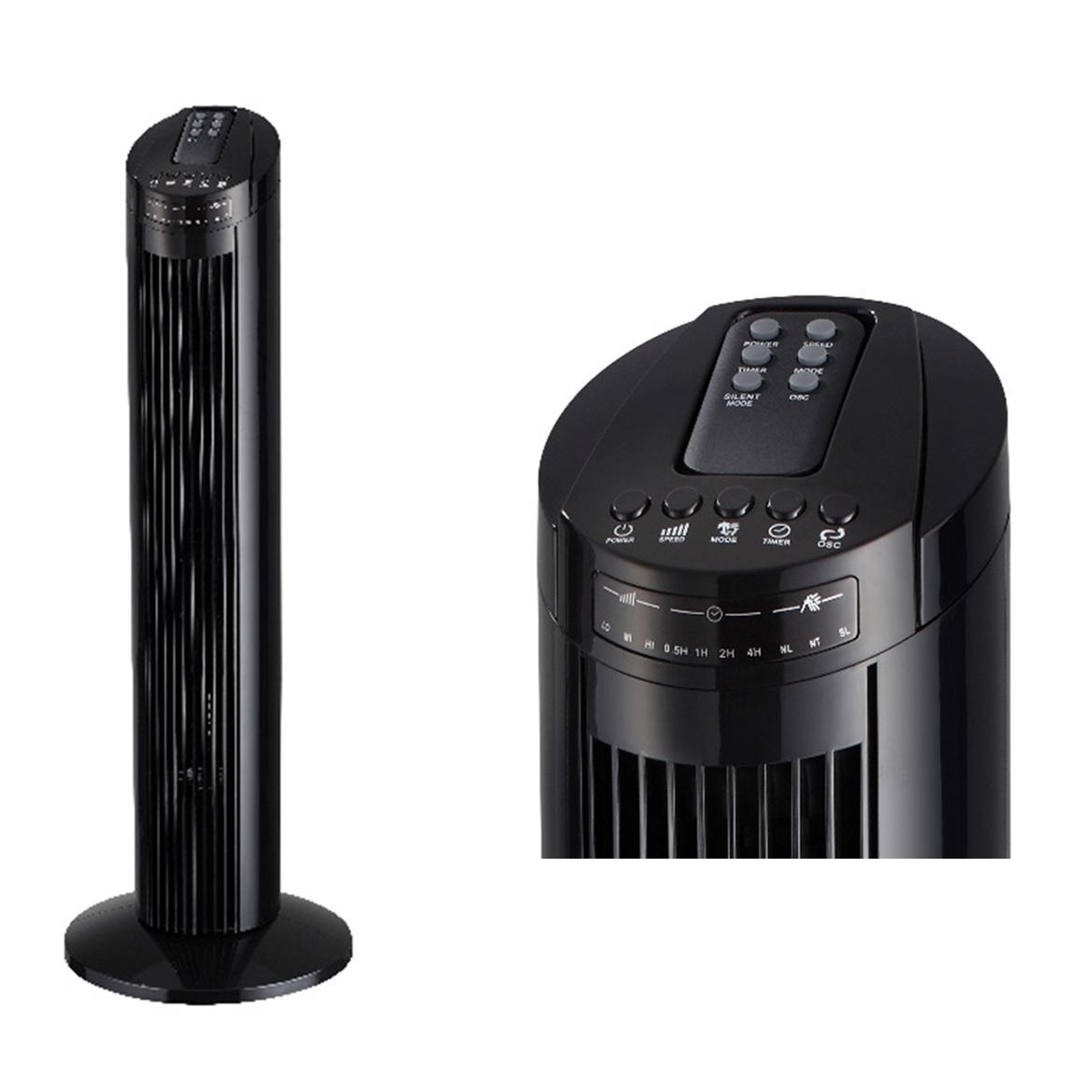 TF-2902R TOWER FAN Color: Black / White Material: ABS Size: 27 x 27 x 75cm Weight: 2.7kg Push-button control & remote control 3 speed 3 Wind mode (normal/natural/sleep) With LED display