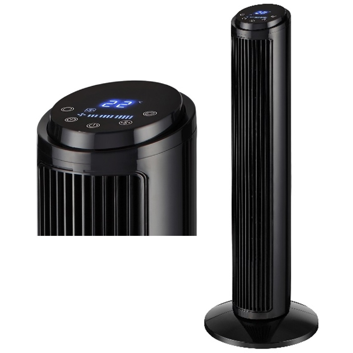 TF-K2907R TOWER FAN Color: Black / White Material: ABS Size: 27 x 27 x 75cm Weight: 2.7kg Touch control & remote control 3 speed 2 Wind mode (normal/sleep) With LED display